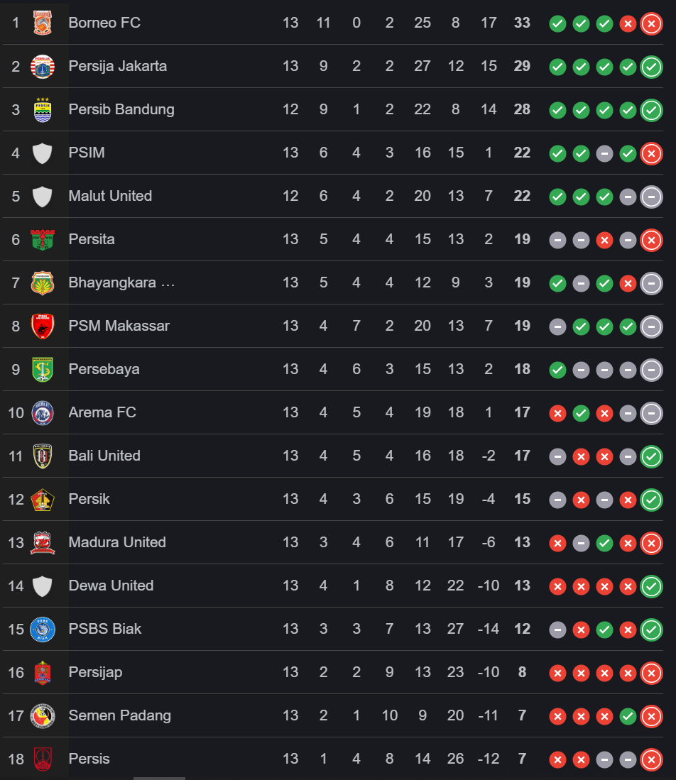 Borneo FC semakin memantapkan posisinya sebagai favorit kuat juara di paruh musim ini, unggul empat poin dari Persija Jakarta yang menempati posisi kedua dengan 29 poin dari 13 pertandingan. Macan Kemayoran juga menunjukkan performa impresif dengan 9 kemenangan, 2 imbang, dan 2 kekalahan.
