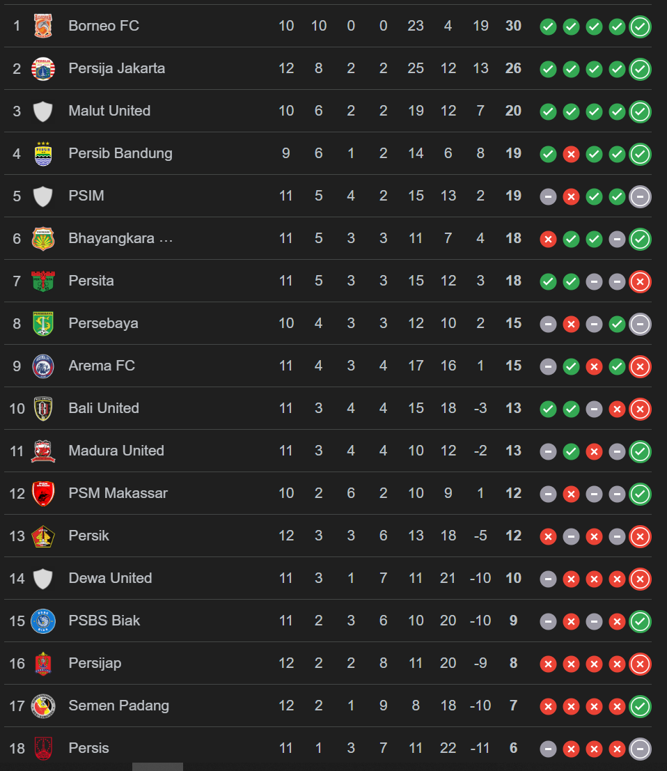 Di papan tengah, sejumlah klub mulai kehilangan ritme. Bhayangkara FC dan Persita sama-sama mengantongi 18 poin, sementara Persebaya dan Arema FC mengumpulkan 15 poin, hasil dari performa yang naik turun sepanjang Oktober dan November.